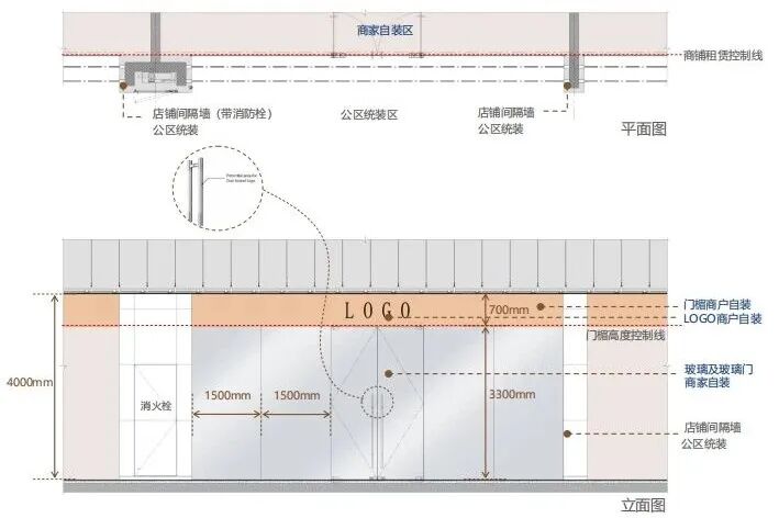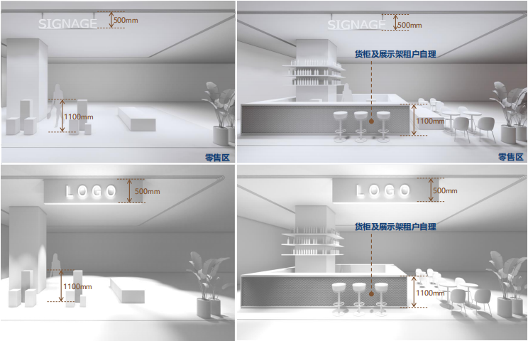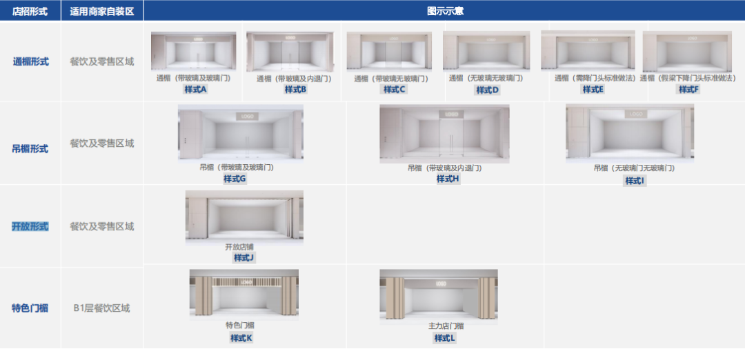 整个零售区域以及B1层美食街区的内场店铺,则针对天花、地面、墙面的边界控制,以及LED屏、橱窗、灯箱等,给出了相应的设计控制标准,尤其在门楣的设计指引上,针对通楣形式、吊楣形式、开放形式、特色门楣,做了12款详尽的指引方案,以达到内场店铺与公共空间整体上的匹配与统一性。