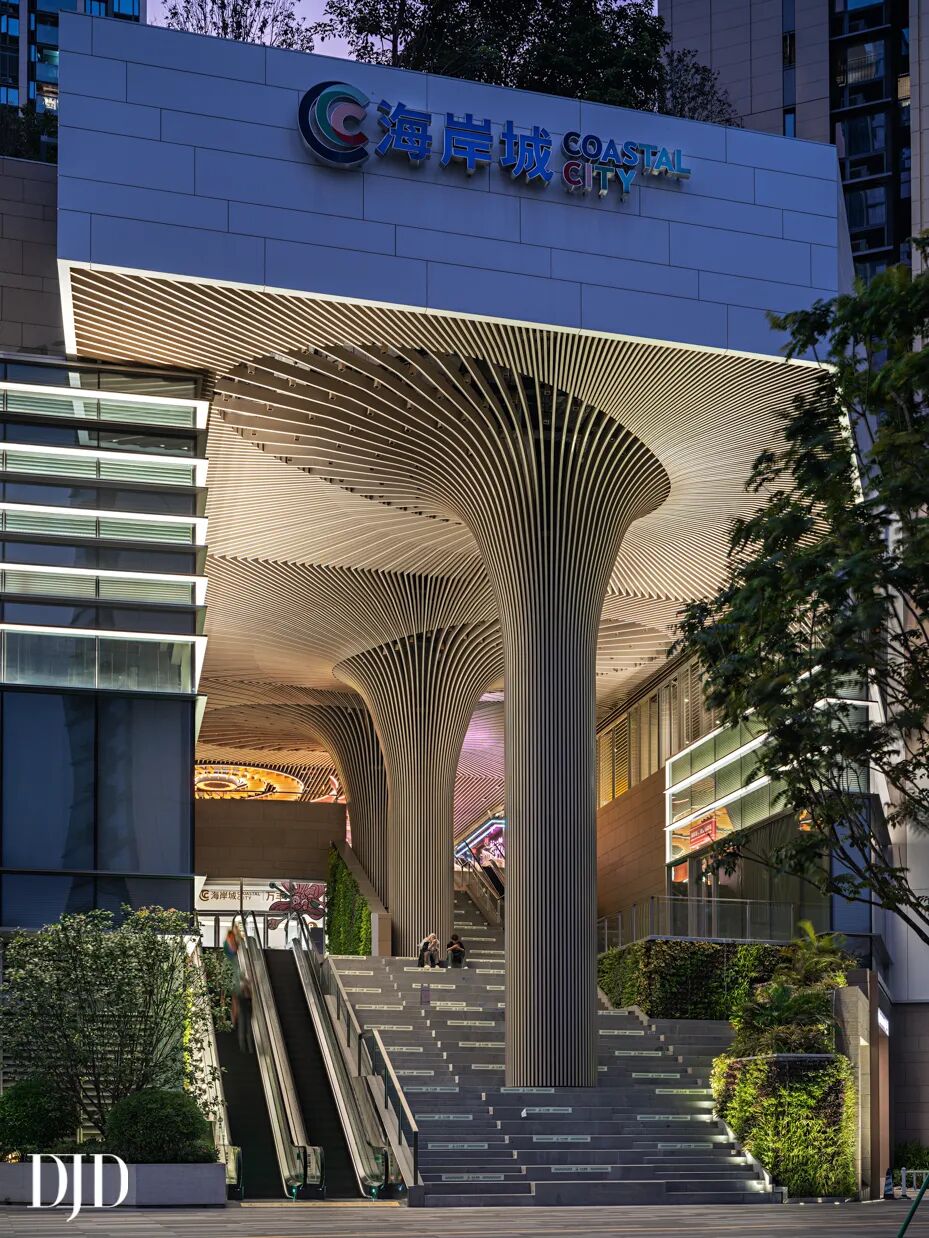 入口的设计充分考虑了海岸公园的客流导入,有意将自然的意识形态融入建筑本身。三座20m高巨树错落于天阶,通过阶梯式的花园景观延展出了一个半户外扩展区,由外而内的延伸自然风景,大幅提升商业空间呼吸感,强化项目第一印象的独特记忆点。