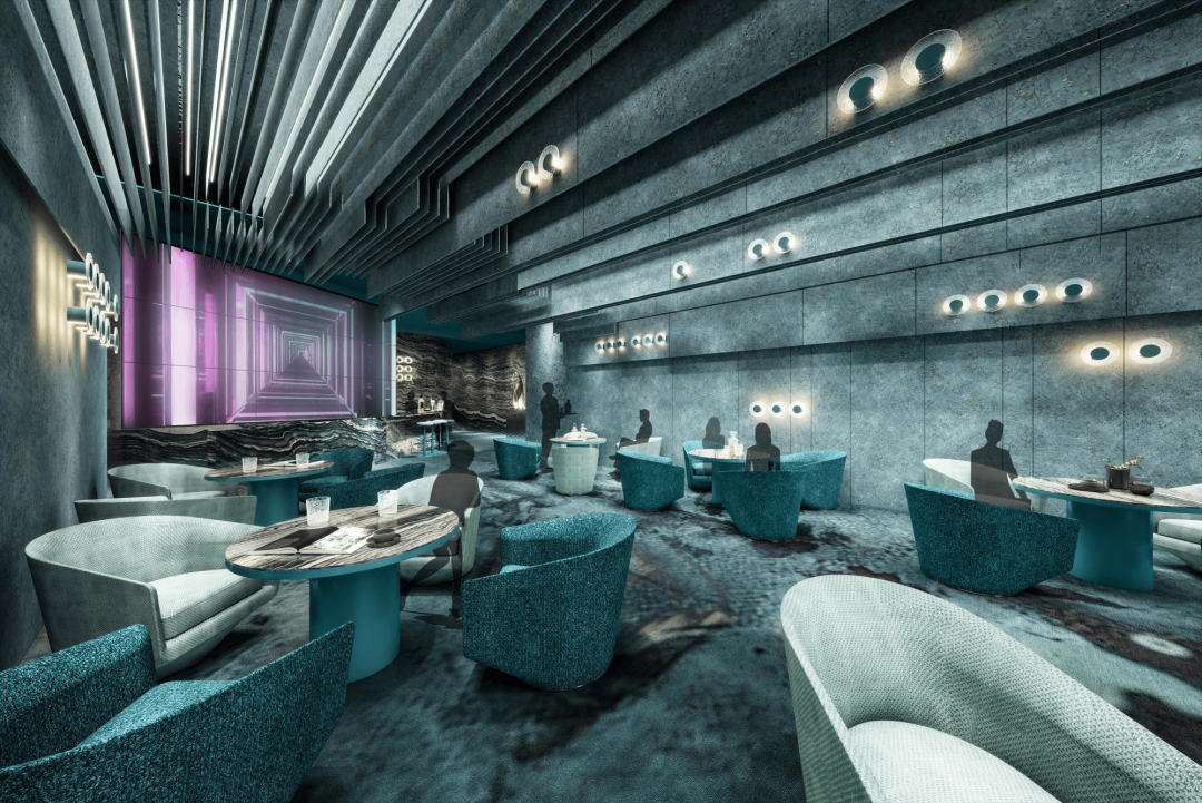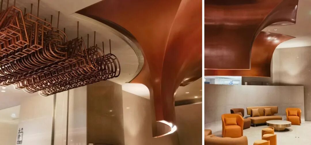 结合中庭空间开阔与汇聚效应,设计团队将风景转化为场景,在现代的场景中,融入水系的灵动与层叠形态,赋予整个空间以动感的韵律。