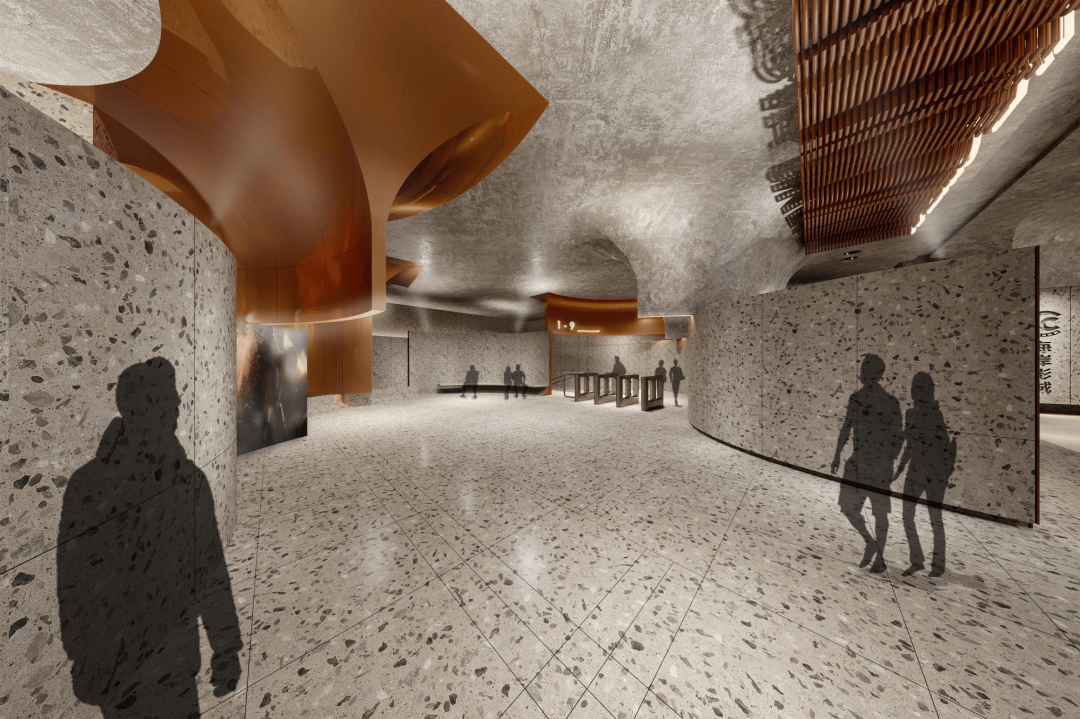 别有一番风景的自然场景,在这里艺术化的设计表达,空间呈现出丹霞山岩色调的特征,影院大堂以不规则空间的处理手法,大面积铺排不同工艺的石材,双曲铝板以弧面造型延伸至天花,打造一个极具神秘色彩的“冒险”空间。