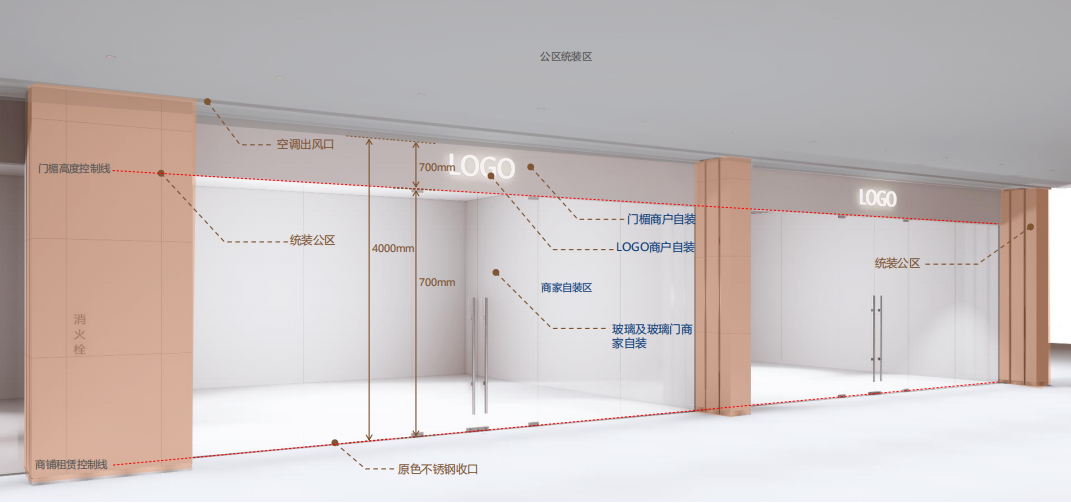 在公共空间之外,项目对于外场、内场、中岛店铺的设计,从交付标准、门楣、灯光等设计细节、材料控制要求等方面,制定了一系列标准化的指引。在鼓励自由表达创意设计的同时,确保其设计与整体风格匹配,并符合万丰海岸城购物中心的整体设计风格。