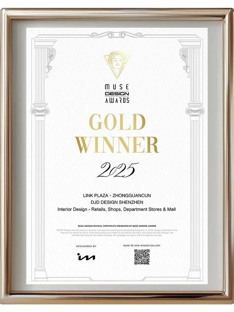 在近日公布的2025年度美国缪斯设计奖获奖名单中,DJD以“北京中关村领展广场”项目,从全球超过一万件顶尖参赛作品中脱颖而出,实力斩获 “商业空间设计类——金奖”。